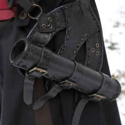 Aan de ring van deze riemhouder met lussen kan een strijdbijl worden gehangen. De houder is gemaakt van 2,4 tot 4 mm dik leer en is 20 cm hoog en maximaal 12 cm breed.