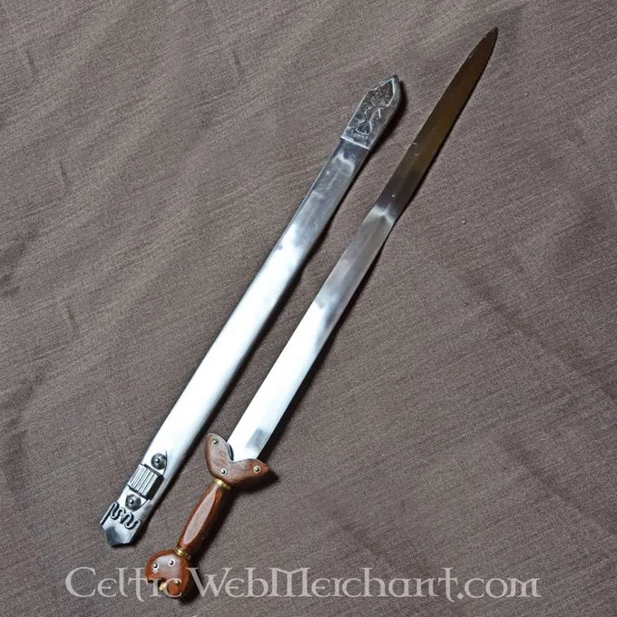 De grip is van hout gemaakt. De meegeleverde schede is van ijzer en gedecoreerd in de La Tène kunststijl.