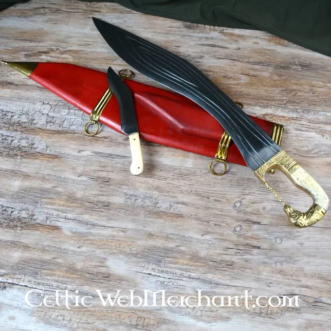 Het zwaard is 63 cm lang en heeft een kling van 52 cm. De grip is gemaakt van been en messing. De houten schede is van hout gemaakt en met rood leer overtrokken. Met de schede en de falcata komt een mes van 23 cm.