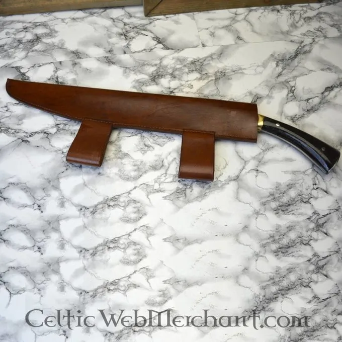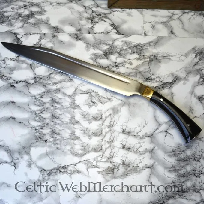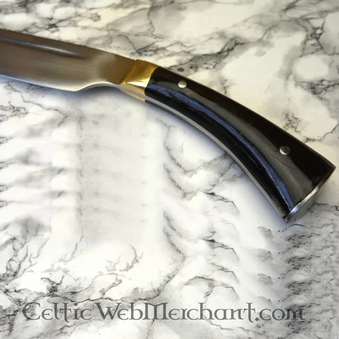 Productdetails: Lengte: 60 cm / Klinglengte: 44 cm / Griplengte: 16 cm / Klingbreedte: 5.5 cm / Gewicht: 1350 g / Staaltype kling: En45 koolstofstaal / Snede: Semi-scherp / Tangconstructie: Volledige tangconstructie / Grip: Horn, messing / Gebaseerd op hi
