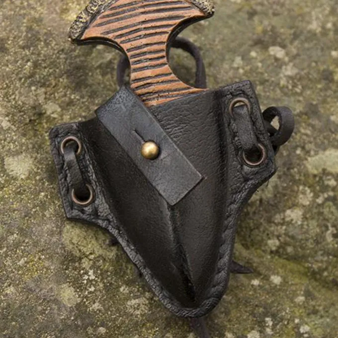 Deze set bestaat uit een leren houder met daarin een LARP vuistdolk. Met de veters kan je de houder aan een belt of bandelier vastmaken. Met een extra lus kan je het mes goed vastzetten in de houder zodat hij zelfs in het heetst van de strijd gewoon goed blijft zitten.