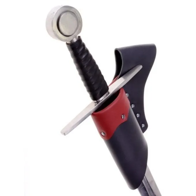 Deze leren zwaardhouder is gemaakt van nappaleer. De zwaardhouder is geschikt voor LARPzwaarden tot een diameter van 6 cm. Je kan de houder aan je riem hangen zodat je je zwaard snel kunt trekken tijdens LARP battles.
