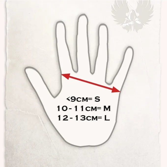 Geweldige handschoenen voor zwaardvechten, HEMA, reenactment, LARP en trainen. Deze handschoenen zijn gemaakt van hoge kwaliteit en stevig suedeleer. Ze zijn erg geschikt voor battles omdat ze vanbinnen gevoerd en verstevigd zijn. Tegelijkertijd voelt het zachte materiaal comfortabel aan op de huid. Ze zijn ook perfect te dragen onder stalen gauntlets. Deze handschoenen zijn verkrijgbaar in verschillende maten. Meet de afstand tussen je wijsvinger en je pink op de handpalm. Maat S: t/m 9 cm breed, maat M: t/m 11 cm breed, maat L: t/m 13 cm breed. Je kan de maat van de pols aanpassen met een drukknop.