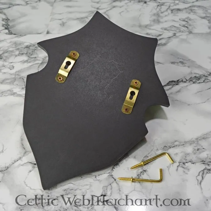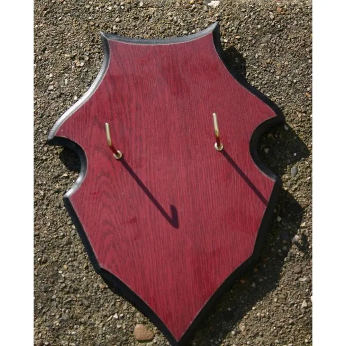Dit houten schild is ideaal voor in de huiskamer van uw kasteel of woning. Op de twee haken aan de voorkant kan een zwaard worden gelegd.