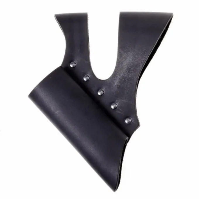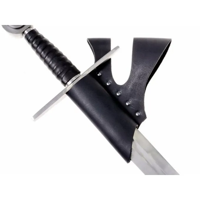 Deze zwaardhouder is gemaakt van splitleer. Hij is zowel geschikt voor re-enactmentzwaarden, voor bijlen als voor smalle larpzwaarden.