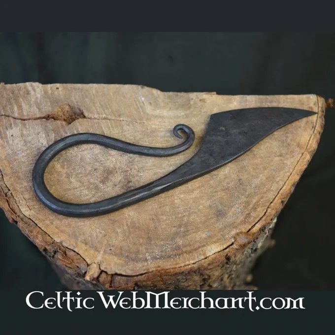 De krul aan de grip van dit mes geeft hem een typisch uiterlijk. Het mes is met de hand van koolstofstaal gesmeed, heeft een lemmet van 6 cm en is in totaal 15 cm lang.