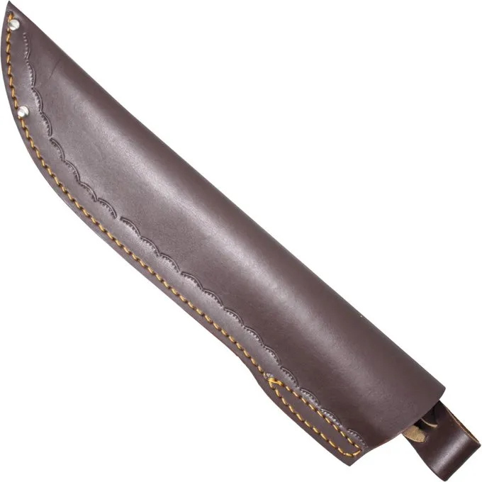 Materiaal: koolstofstaal, hout, leer, hoorn, messing / / Snede: vlijmscherp / / Lengte: 38 cm / / Lengte kling: 24 cm / / Levering inclusief leren hoes / / Gebaseerd op een historisch origineel